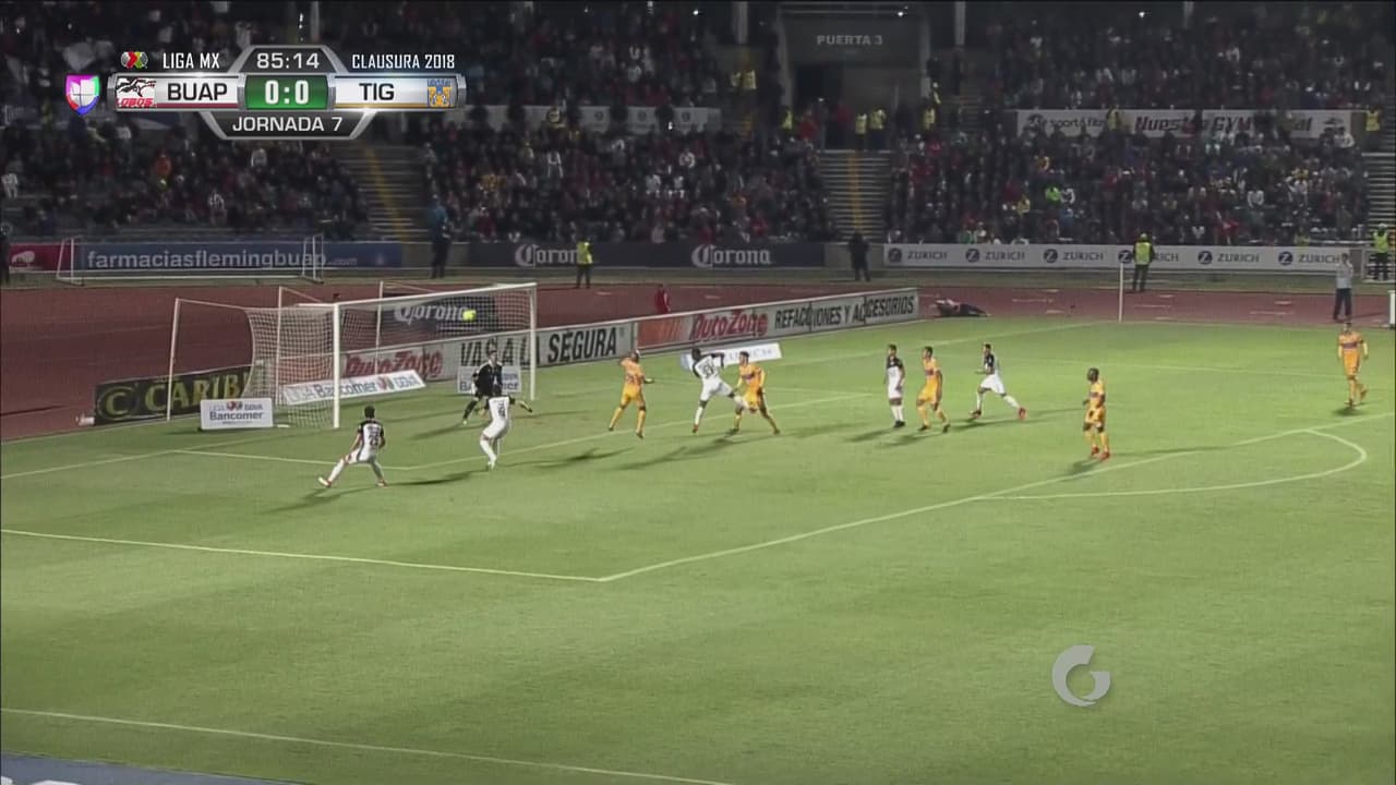 La estrella de Lobos BUAP se eleva en el área y conecta un buen testarazo pero la pelota pasa desviada del arco de Tigres.