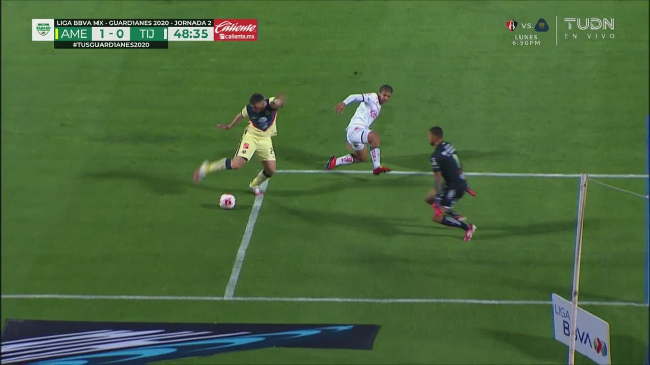 América tuvo un inicio de complemento dominante, con juego a dos toques, fijación de los centrales rivales con los dos delanteros para liberar a los extremos. Así fue como generaron llegadas por ambos sectores. Además, la presión tras pérdida era intensa y eso permitía frenar a Xolos sin que causaran daño.