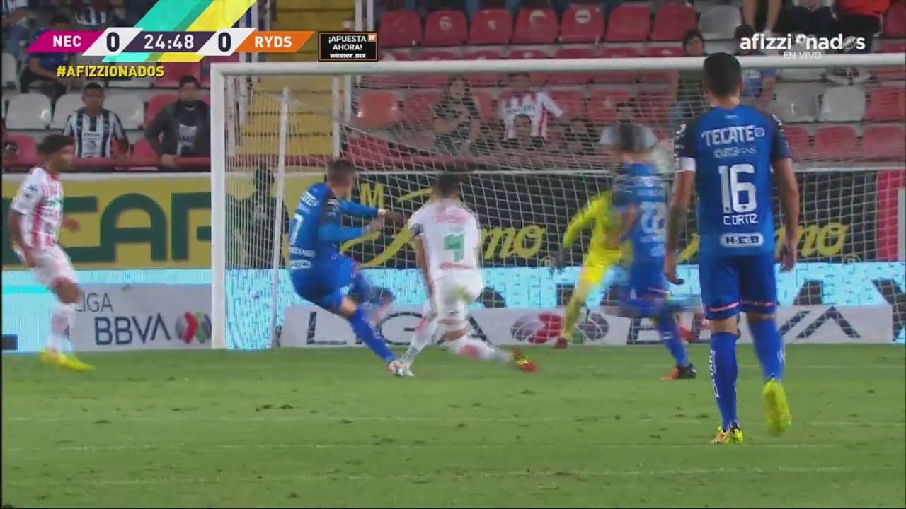 El delantero disparó desde fuera del área y el balón pasó muy cerca de la portería de Necaxa al 25’.