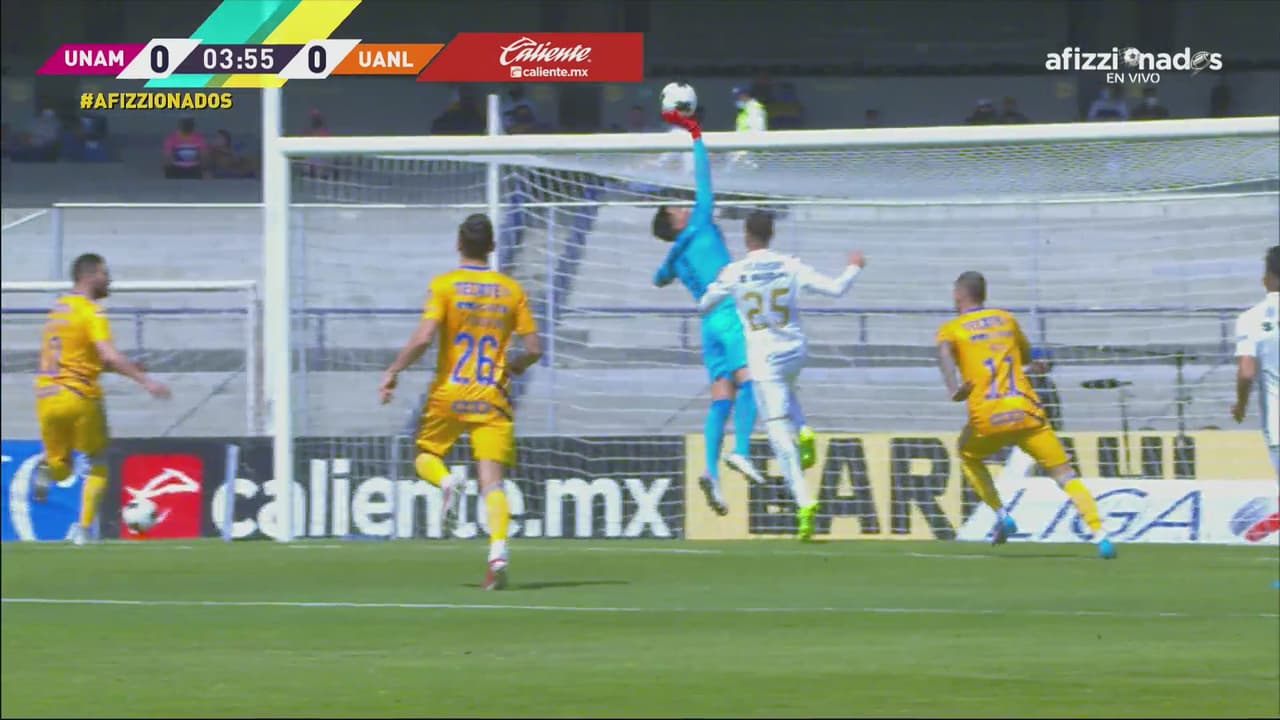 Pumas reaccionó y fue el brasileño Diogo quien tuvo la oportunidad de rematar al arco, pero Nahuel Guzmán hizo gala de sus buenos reflejos para desviar el disparo y evitar el gol de la UNAM.