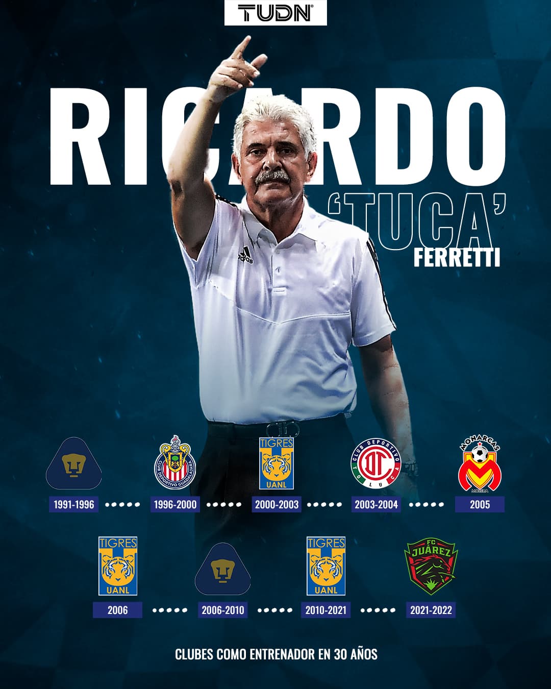 Luego de hacerse viral por su reacción de tristeza tras el ‘descenso’ deportivo de Bravos, ‘Tuca’ Ferretti pondrá fin a su récord histórico de 19 años ininterrumpidos como técnico en Liga MX, luego de renunciar al FC Juárez y que los clubes mexicanos ya tienen ocupada la posición. Fue el Apertura 2003 el último torneo en que empezó sin equipo, pero Toluca lo fichó a mitad de temporada.