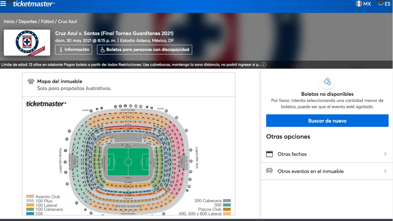 Con algunos screen shots de la página encargada de la venta de entradas, el mensaje que se lee al querer realizar la compra es de “boletos no disponibles” para el evento del 30 de mayo próximo.