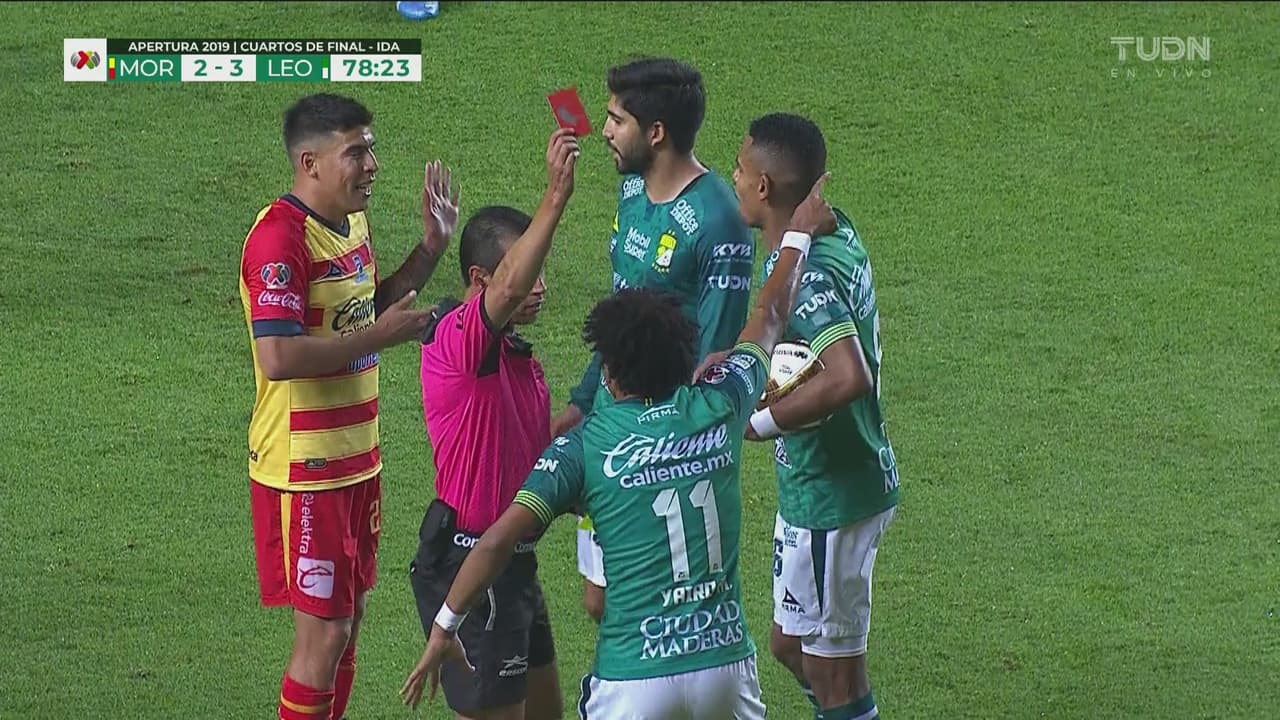 El silbante decretó doble tarjeta amarilla y expulsión para el jugador del León tras un golpe sobre el ariete del Morelia al minuto 79.