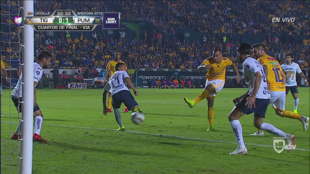 Gran recorte de Dueñas, quien centró, la pelota le quedó a Vargas pero su disparo fue flojo y a la humanidad de Saldívar.