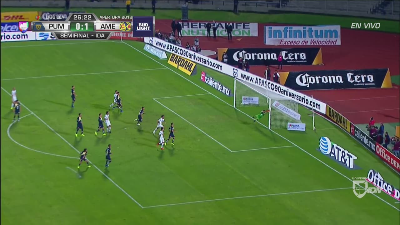 Pumas despabiló y tuvo par de opciones para ponerse en ventaja en el marcador. La primera con un espectacular tiro de Carlos González y d espués con una buena jugada colectiva que Marchesín atajó.