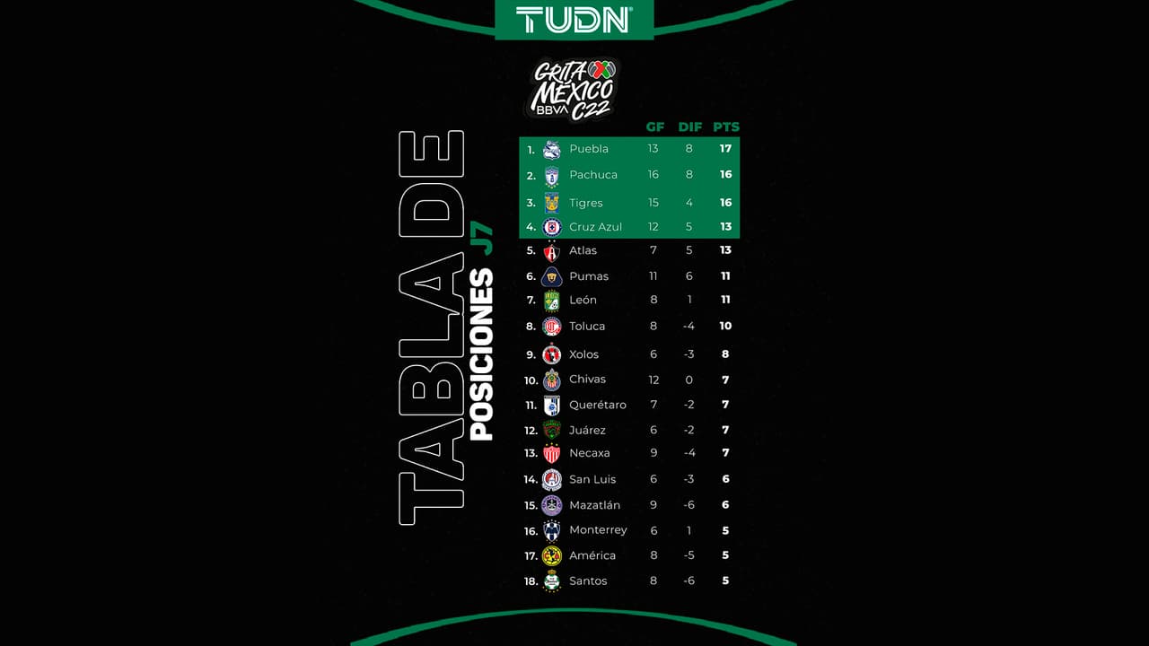 El puntero sigue siendo el Puebla con 17 puntos, que volvió a ganar ahora al remontar un 2-0 ante Chivas. El equipo de Nicolás Larcamon es toda una realidad. Debajo vienen Pachuca y Tigres con 16 unidades, Cruz Azul cayó ante Santos Laguna, pero con 13 se mantiene en la cuarta posición.