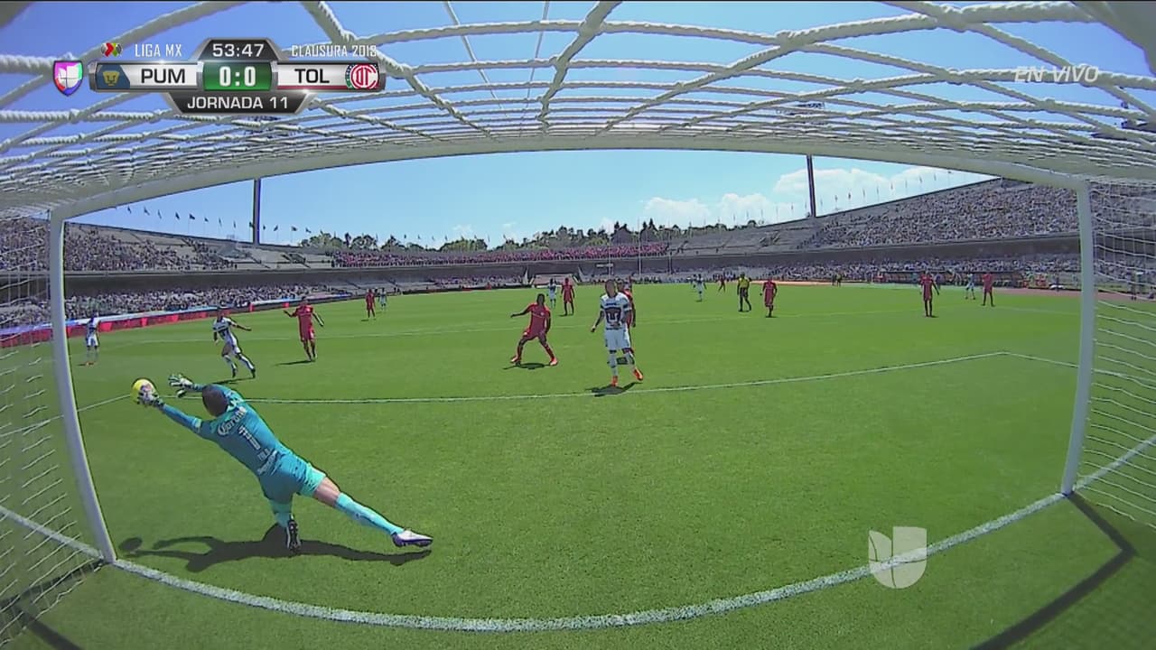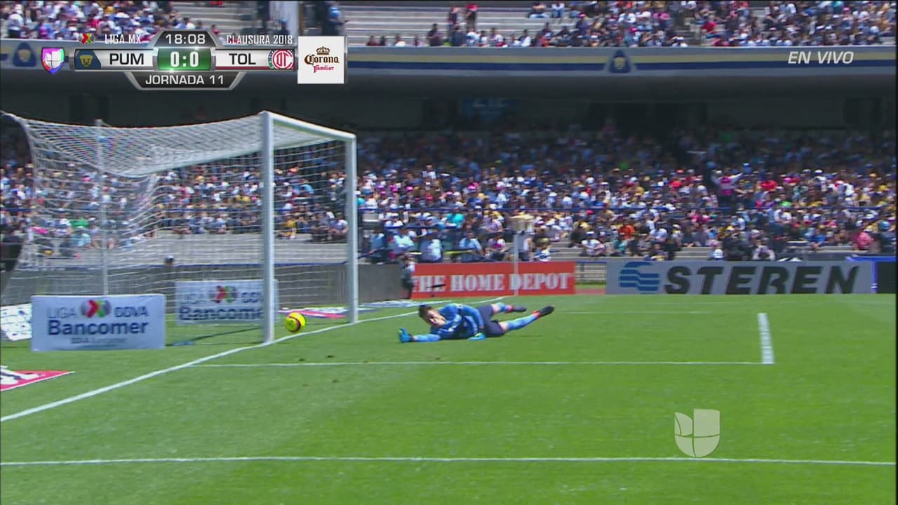 El ‘Chavo’ se enfiló solo al arco de Pumas y al disparar sería tapado por Osvaldo González para evitar el tiro.