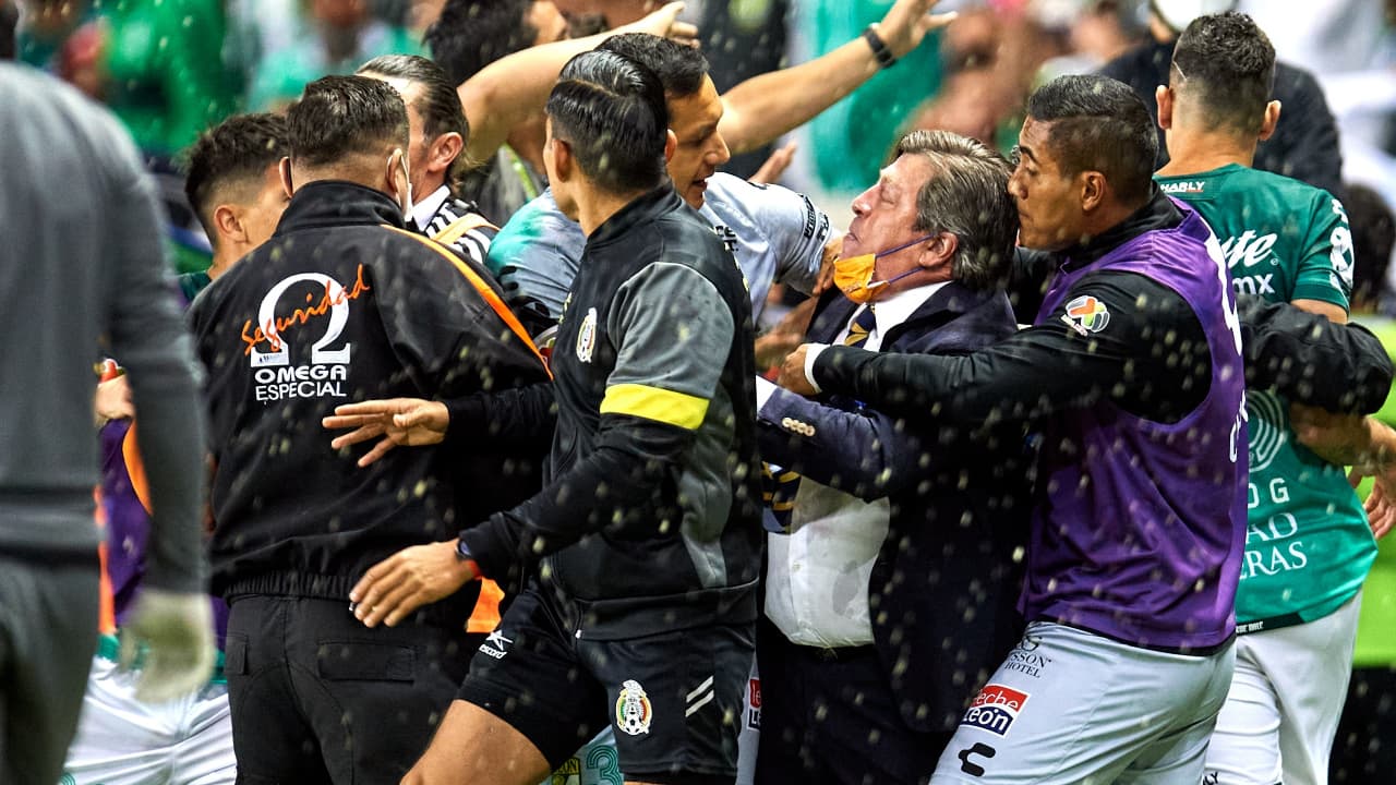 Con menos de 10 minutos por jugarse en el Nou Camp cayó el segundo tanto de la visita obra de Ángel Mena y eso desató la euforia en las bancas, pero no quedó ahí ya que trascendió con empujones y golpes.