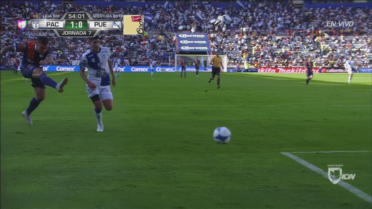 El volante del Puebla le ganó en la carrera a Tapias y frente a Blanco mandó el balón por fuera del arco.