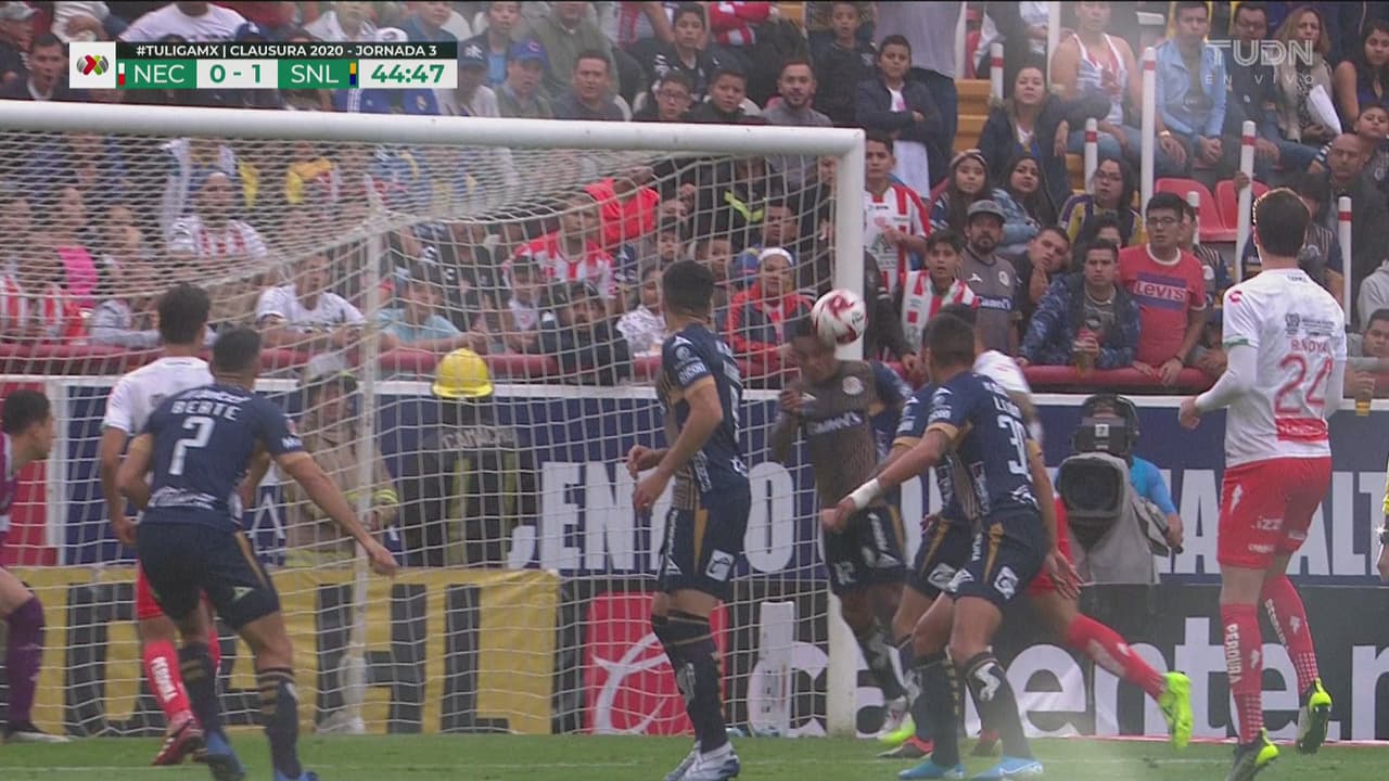 El mediocampista del San Luis evita, en la línea, que entré el testarazo de Maxi Salas.
