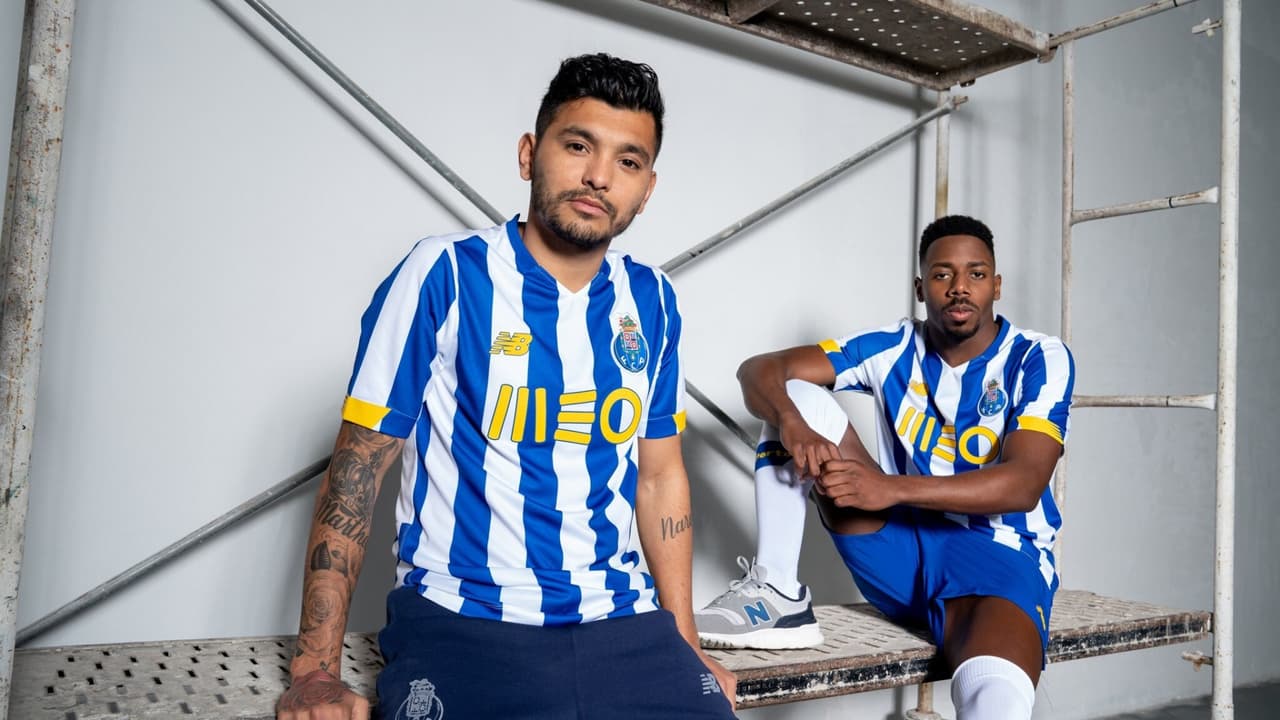 El nuevo uniforme del Porto respeta los colores clásicos con líneas azules y blancas en forma vertical y pequeñas franjas en color amarillo en los antebrazos.