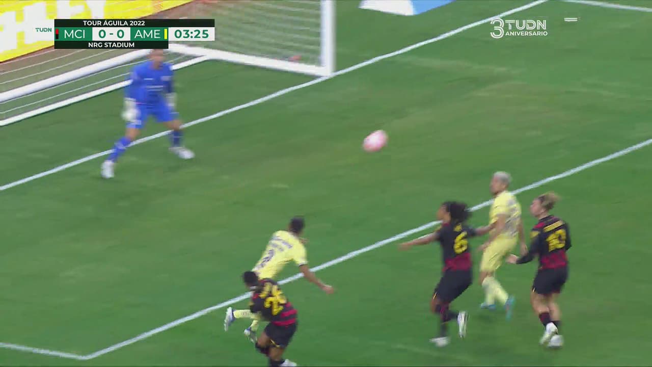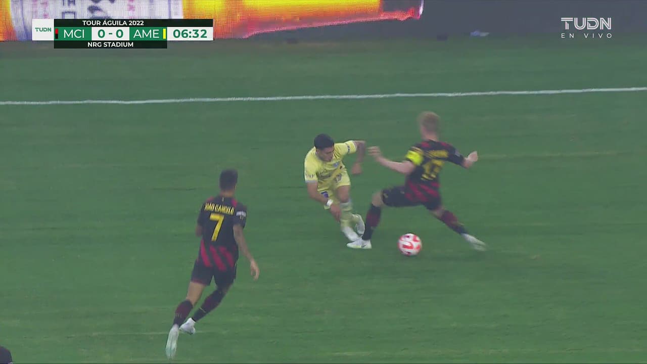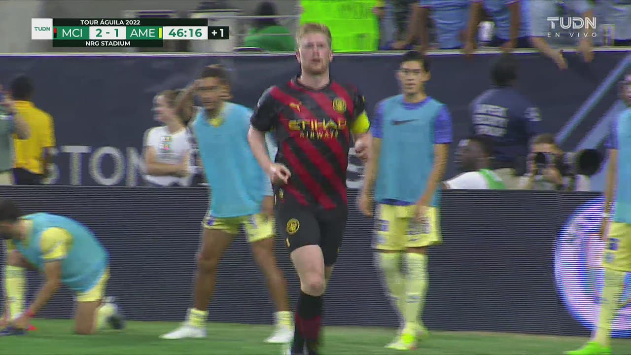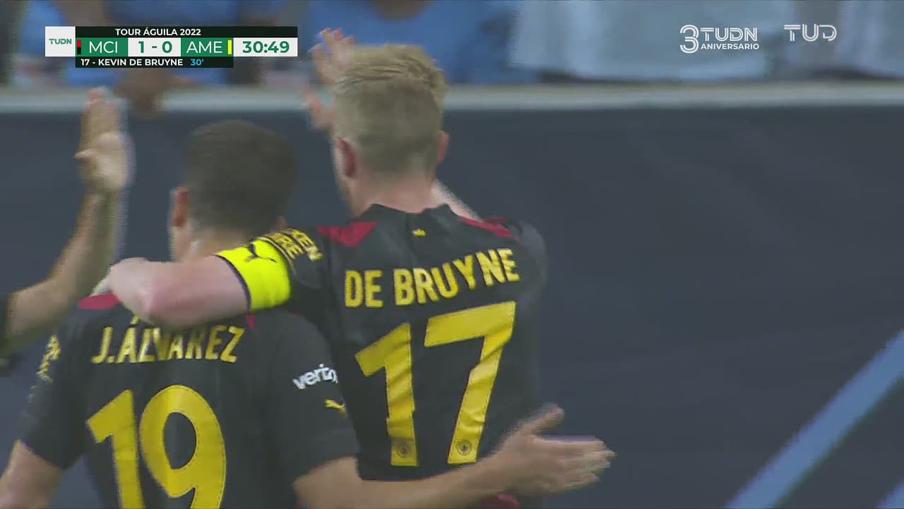 América no pudo despejar y De Bruyne marcó el 1-0 con un golazo: Emilio Lara y Jorge Sánchez no cortaron la jugada, Kevin ganó los rebotes y puso el balón en el ángulo al 30'.