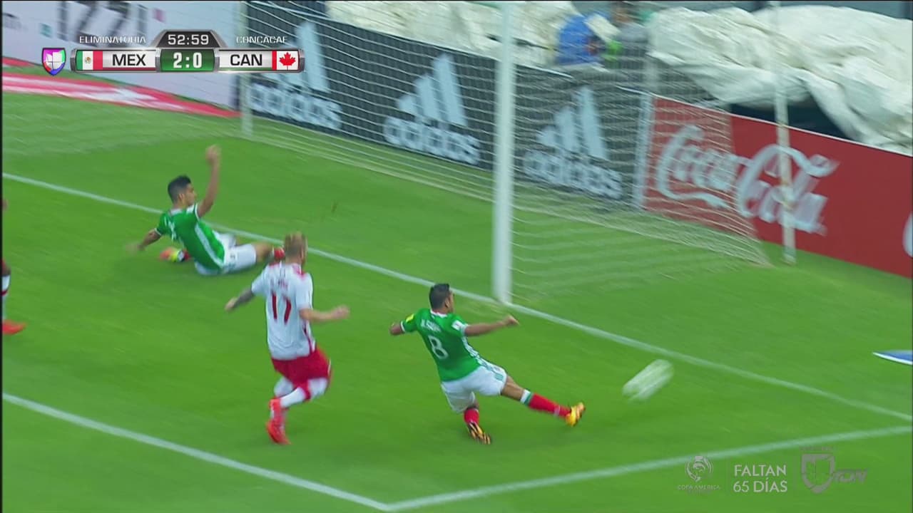 Andrés Guardado desde la banda derecha centra y Raúl Jiménez y Marco Fabián se quedan cortos ante un arco vacío.