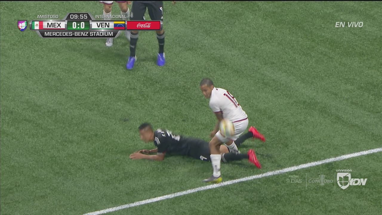 El defensa de Venezuela empujó al extremo del Tri pero el árbitro central dejó correr la jugada y solo marcó una segunda falta sobre Charly Rodríguez.