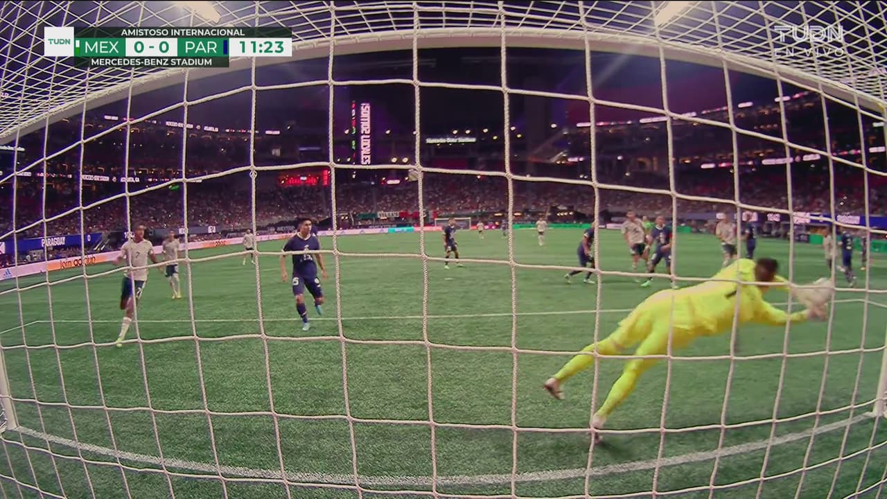 El central del Tri ganó el cabezazo a primer poste, el balón pico y el portero guaraní alcanzó a desviar.