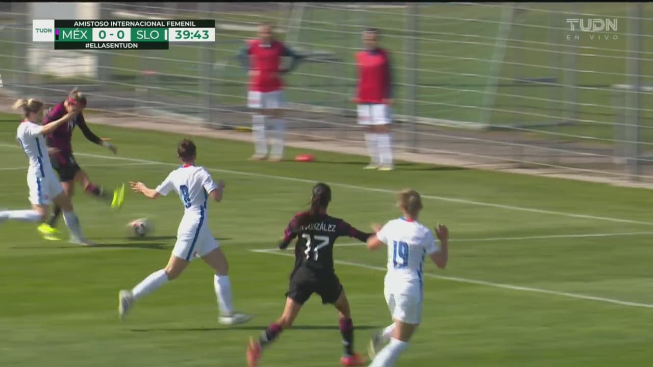 Alicia Cervantes, la goleadora de Chivas y de la Liga MX Femenil en el Guard1anes 2021 con 16 goles, dejó escapar una oportunidad clara cuando recibió un pase filtrado que la dejó sola frente a la portera eslovaca, sin embargo, se tardó, le cayó la marca y erró su remate de tres dedos cuando tenía sola a Alison González por el centro del área.