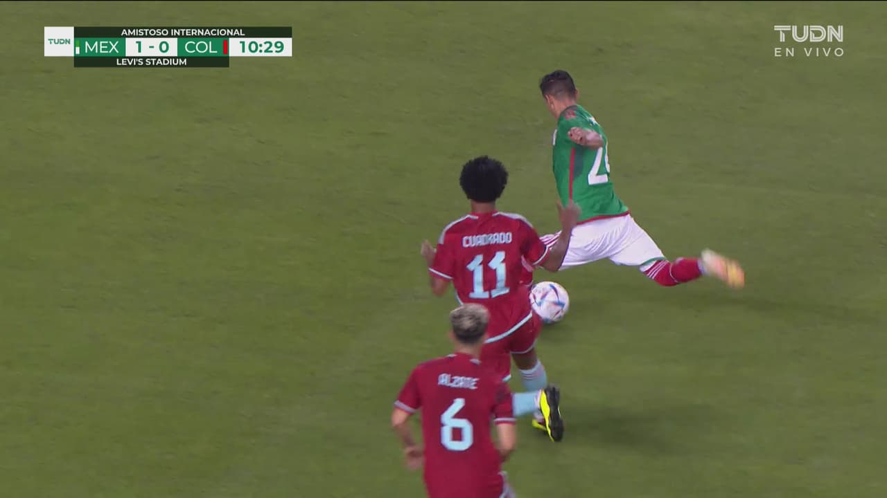 El atacante mexicano saca un cañonazo, pero la puntería no fue la correcta para anotar, al 11'.