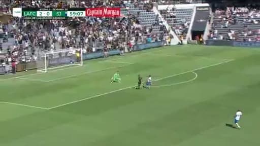 Evita el fuera de lugar al 59', supera a todos por velocidad y su remate se fue por un lado.