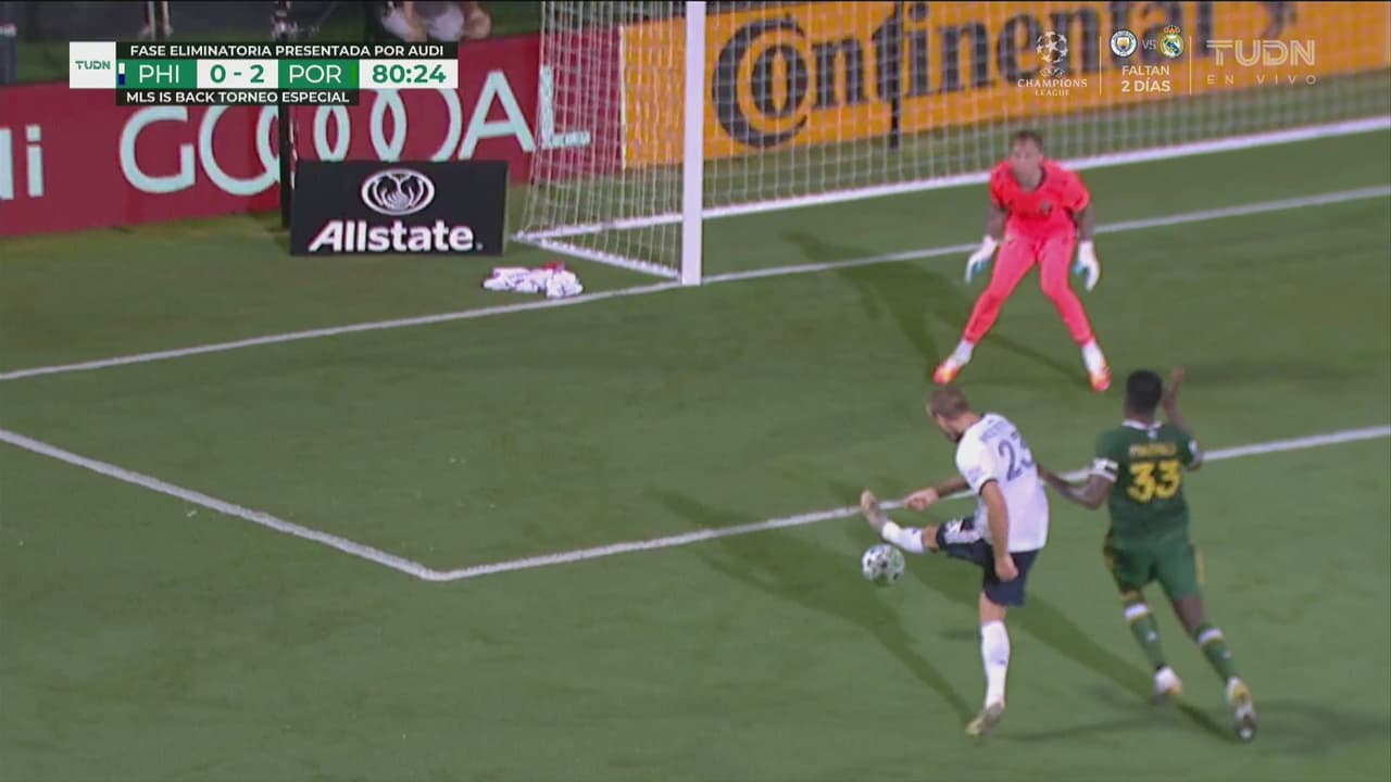 Esta vez fue Kacper Przybyłko el que entró al área del Timbers y en inmejorable posición de anotar estrelló el balón contra las piernas del portero.