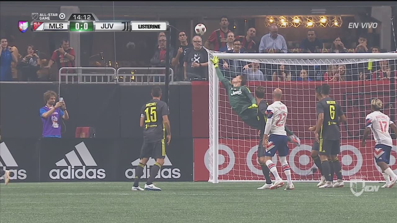 Buen remate de cabeza del jugador del equipo de la MLS para poner la pelota en el travesaño y cimbrar la portería.