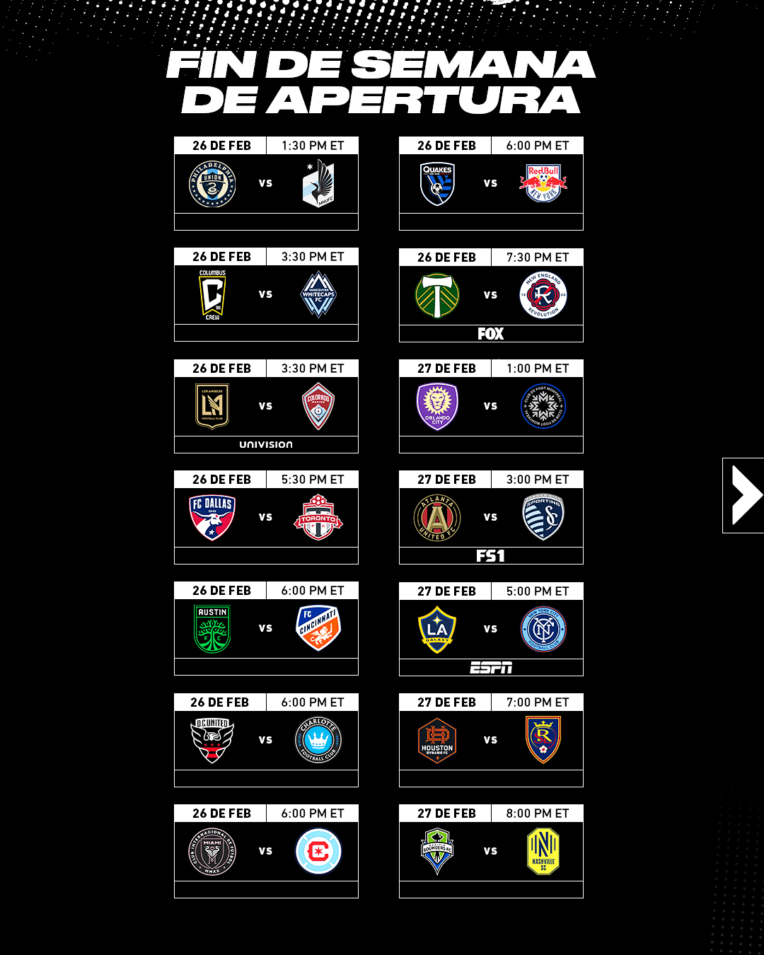 Comenzará con una doble cartelera ese viernes con los duelos entre Philadelphia Union y D.C. United (8 p.m. ET), seguido por 'El Tráfico', en el que LA Galaxy visitará a Los Angeles Football Club (10 p.m. ET) en el Banc of California Stadium (ESPN / ESPN Deportes).