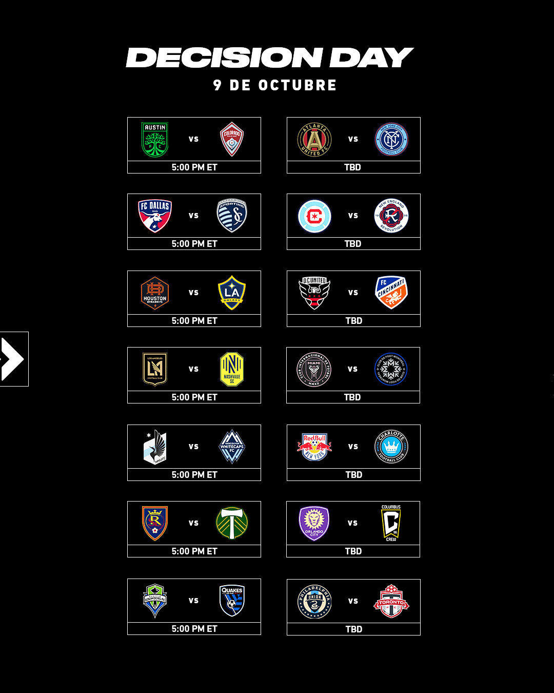 En un final de fiesta a toda orquesta, el domingo 9 de octubre, los 28 equipos se enfrentarán a rivales de sus respectivas Conferencias en el Decision Day, la batalla final por la clasificación a la postemporada. En una doble ventana de transmisiones televisivas en ESPN/ ESPN Deportes y FS1/FOX Deportes, los partidos comenzarán de manera simultánea en cada una de las Conferencias de la MLS.