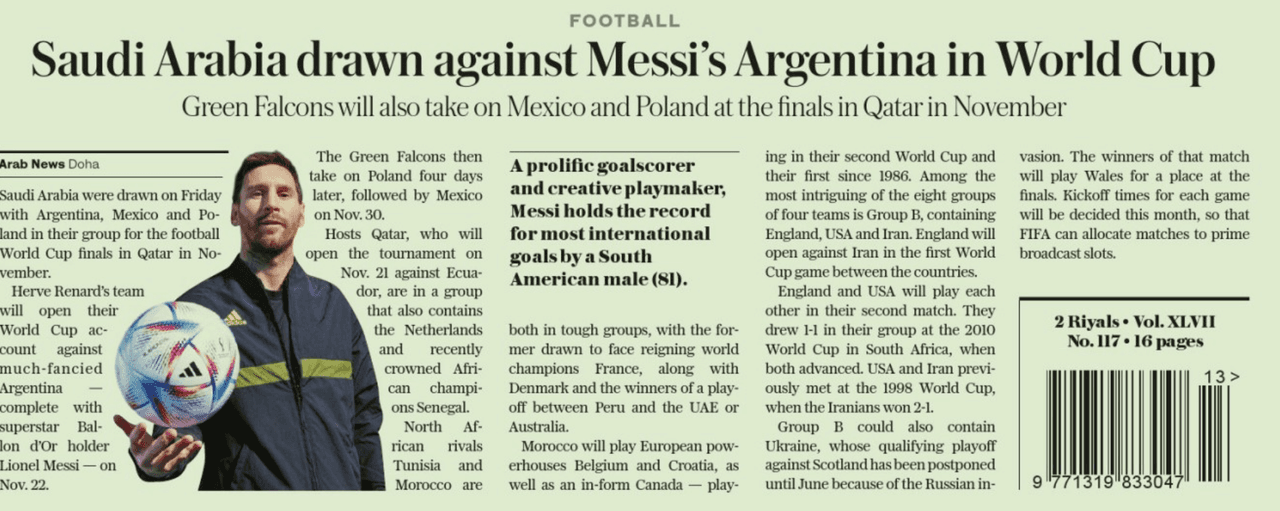 Arab News que edita desde Yeda se limitó a informar la conformación de los grupos para el Mundial Qatar 2022 mientras que para el Al-Madina de Medina, Arabia Saudita enfrentará a algunos de los "equipos más poderosos del mundo" y "duros", aunque resaltó también el hecho de que Irán se enfrentará a Estados Unidos.