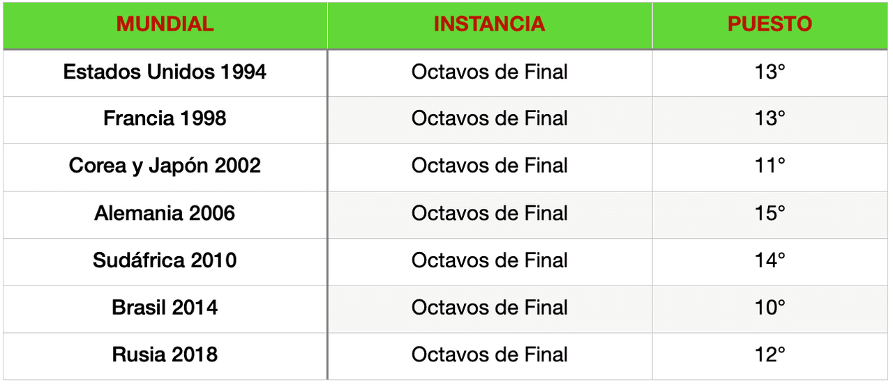 El Tri se ha quedado estancado en la ronda de Octavos de Final desde Estados Unidos 1994 hasta Rusia 2018, donde producto de distintas circunstancias futbolísticoas han quedado eliminados 90 minutos de avanzar a cuartos.