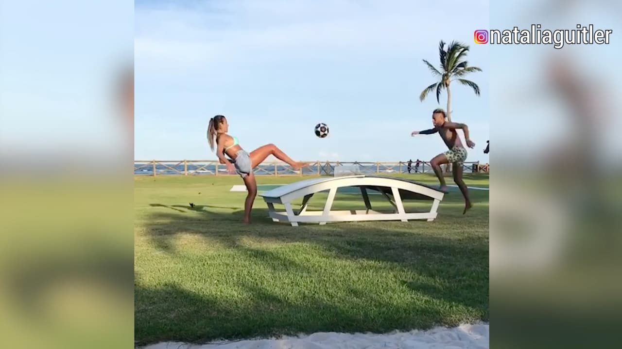El astro brasileño fue baja del partido ante el Nantes por una supuesta dolencia. De vacaciones en su país, Ney la pasa bomba. En este caso se lo ve jugando con Natalia Guitler, estrella de fútbol de playa.