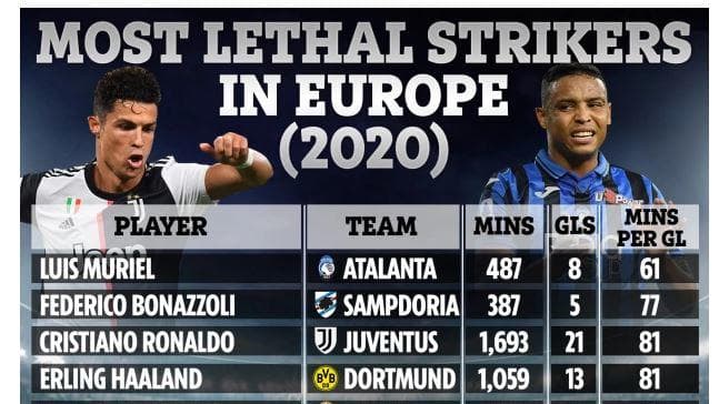 Muriel acumula 8 goles, pero los ha conseguido en tan sólo 487 minutos, es decir anotando un gol cada 61 minutos. En la lista aparecen algunos otros hombres importantes como es el caso de Cristiano Ronaldo que ocupa el tercer lugar marcando un gol cada 81 minutos, consiguió 21 en 1693 minutos de tiempo jugado. La segunda posición es ocupada por Federico Bonazzoli de la Sampdoria que marca un tanto cada 77 minutos acumulando 5 goles en 387 minutos.