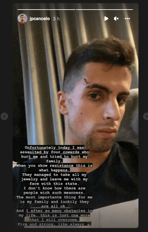 "No sé cómo hay gente con tanta mezquindad. Lo más importante para mí es mi familia y, afortunadamente, todos están bien. Después de tantos obstáculos en mi vida, este es solo uno más que superaré. Firme y fuerte, como siempre", publicó Joao Cancelo en una de sus historias de Instagram junto a la foto de la herida por la ceja.