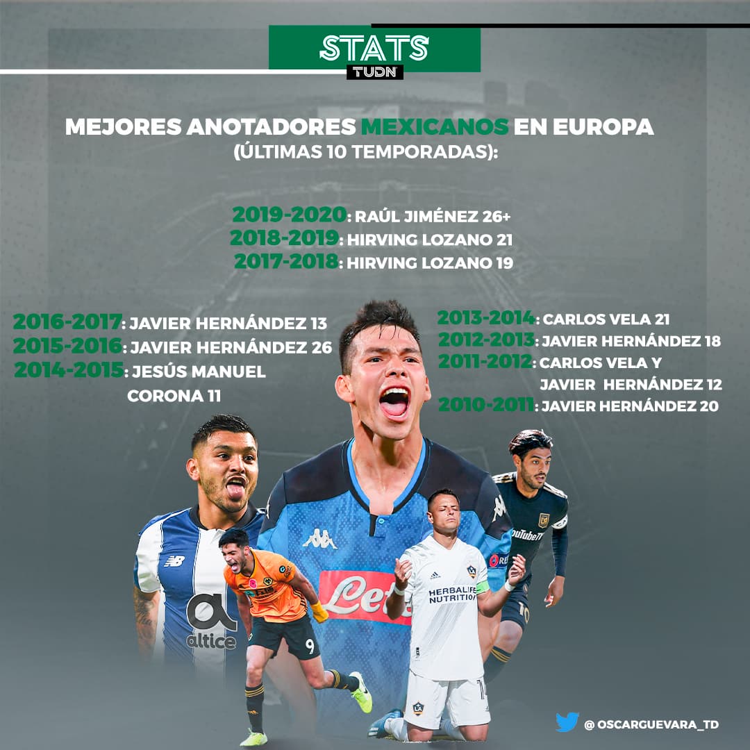 Los más cercanos al 'Lobo mexicano' son Hirving 'Chucky' Lozano y Carlos Vela --el primero aún sigue sumando con el Napoli--, quienes registraron 21 anotaciones con el PSV Eindhoven y la Real Sociedad, respectivamente.