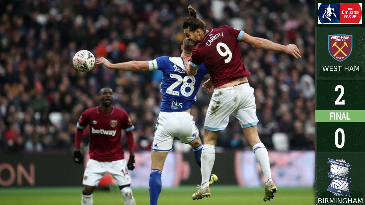 El West Ham derrotó por marcador de 2-0 al Birmingham City, en duelo correspondiente a la FA Cup; partido en el que el mexicano Javier Hernández no tuvo actividad debido a una lesión en los isquiotibiales.