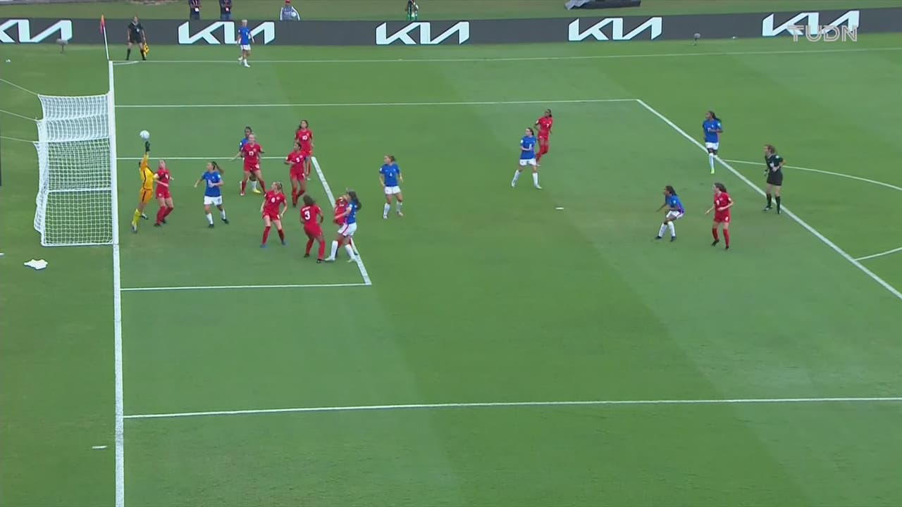 La arquera canadiense de encarga de rechazar el cabezazo de Alice Marques y la zaga salva el contraremate.