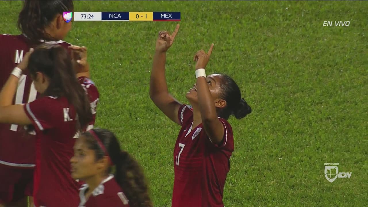 La primera anotación de México se presentó al minuto 15 tras un gran centro por parte de Daniela Espinoza desde la banda izquierda, justo ahí apareció Dayana Cazares con mucha libertad dentro del área, bajó la pelota con gran técnica individual y pateó cruzado para romper el cero.