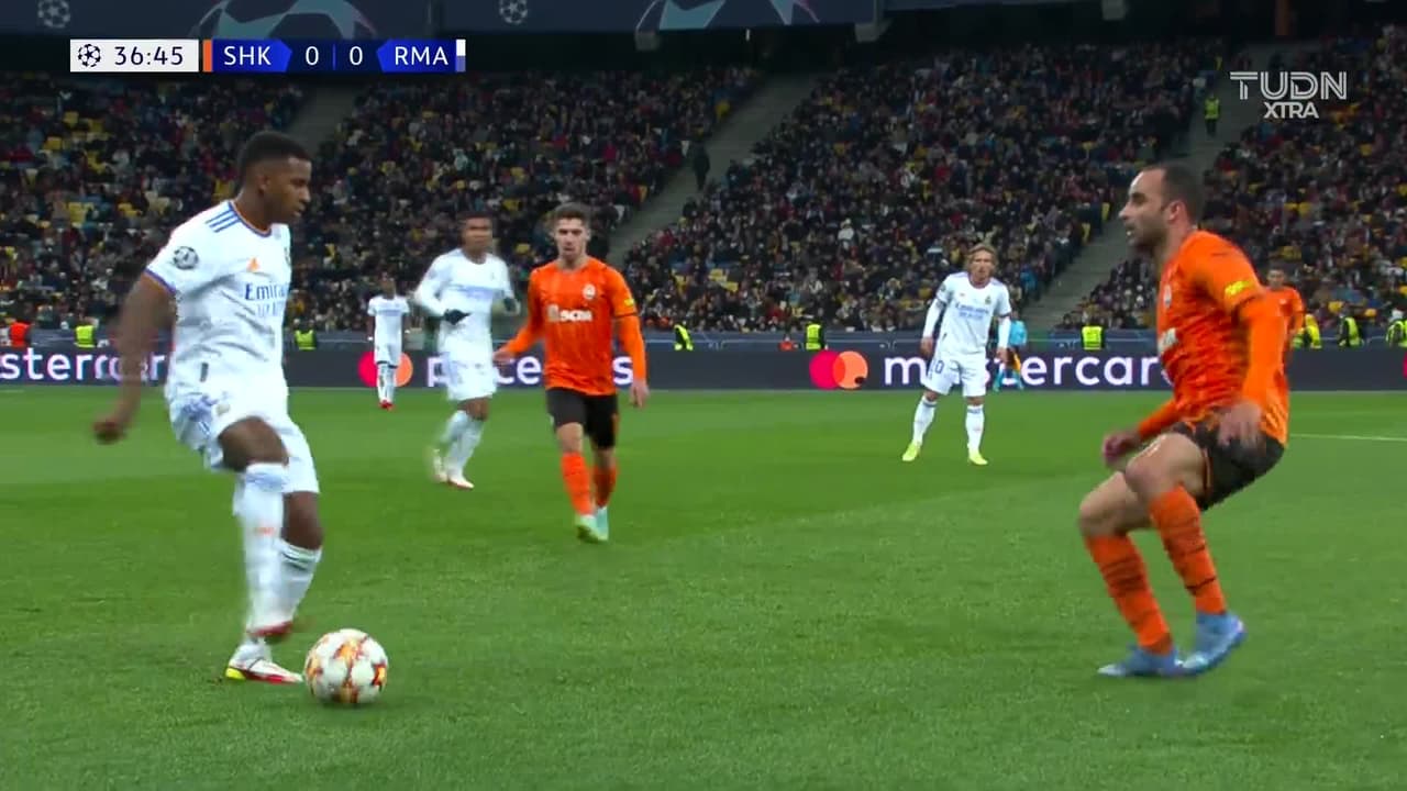 Lucas Vázquez quiso ponerle un 'bombón' a Benzema, pero Kryvtsov intentó despejar y solo la puso en el fondo de su portería.