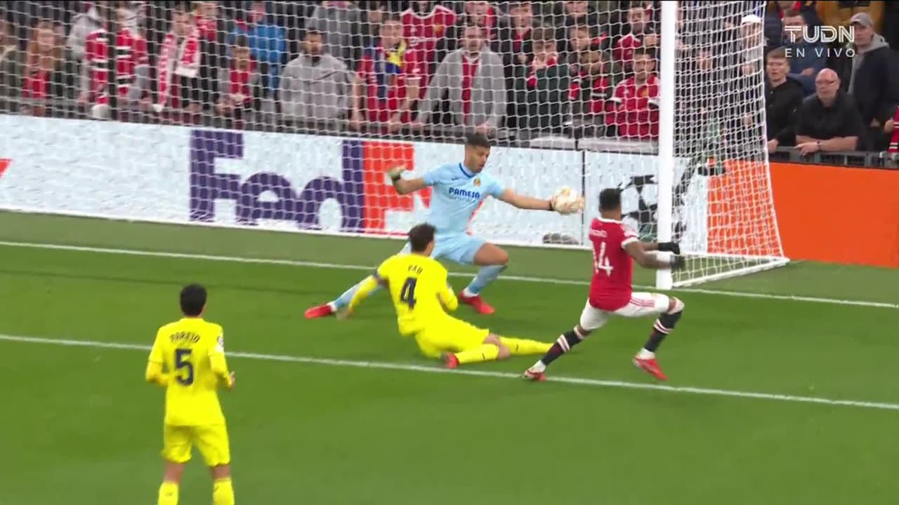 A punto de terminar el compromiso, el Villarreal tuvo una increíble jugada ante el arco, en el que todos los jugadores del United se tiraban para evitar que su arco cayera.