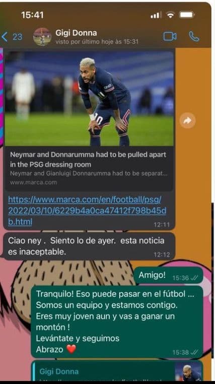 Incluso el atacante del PSG reveló una conversación que tuvo con el guardameta por WhatsApp, en donde Donnarumma le muestra las noticias internacionales que señalan la pelea y Neymar le brinda su apoyo ante el momento complicado para todo el equipo.