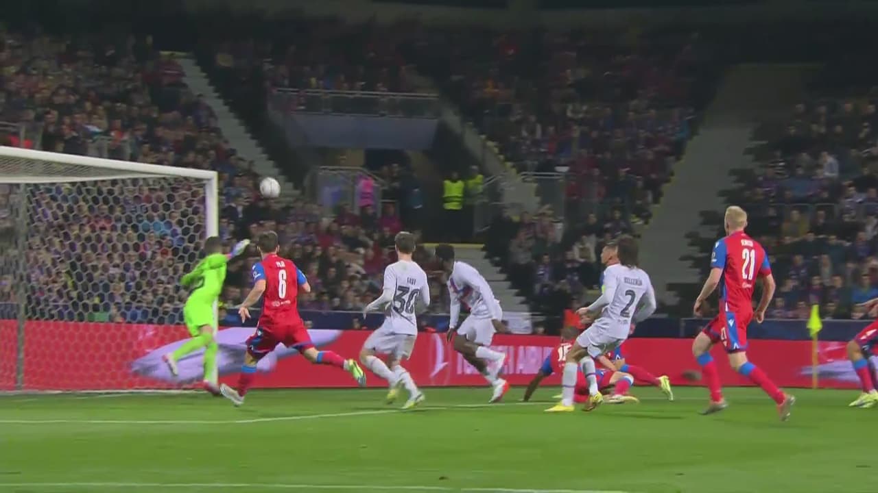 El atacante del Viktoria Plzen la pica demasiado estando muy cerca de la portería y se va una clara.