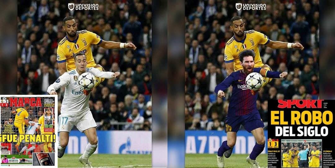 Marca y As de Madrid titularon hoy sus portadas con un contundente: “Fue Penalti”. Pero los periódicos en la ciudad condal, Sport y Mundo Deportivo aseguran lo contrario: “Robo del Siglo”.