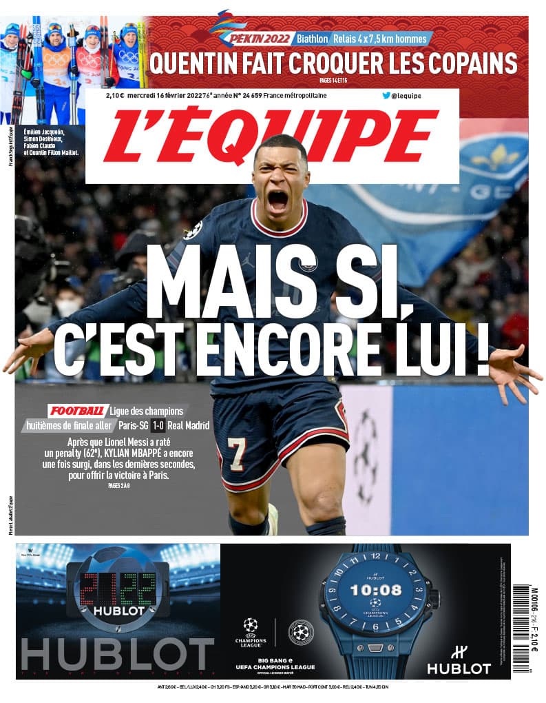 El gran diario deportivo francés ocupa su portada con una imagen de Kylian Mbappé celebrando su gol en los últimos segundos del partido de Octavos de Final de la UEFA Champions League y el título "¡Pero sí, de nuevo él!".