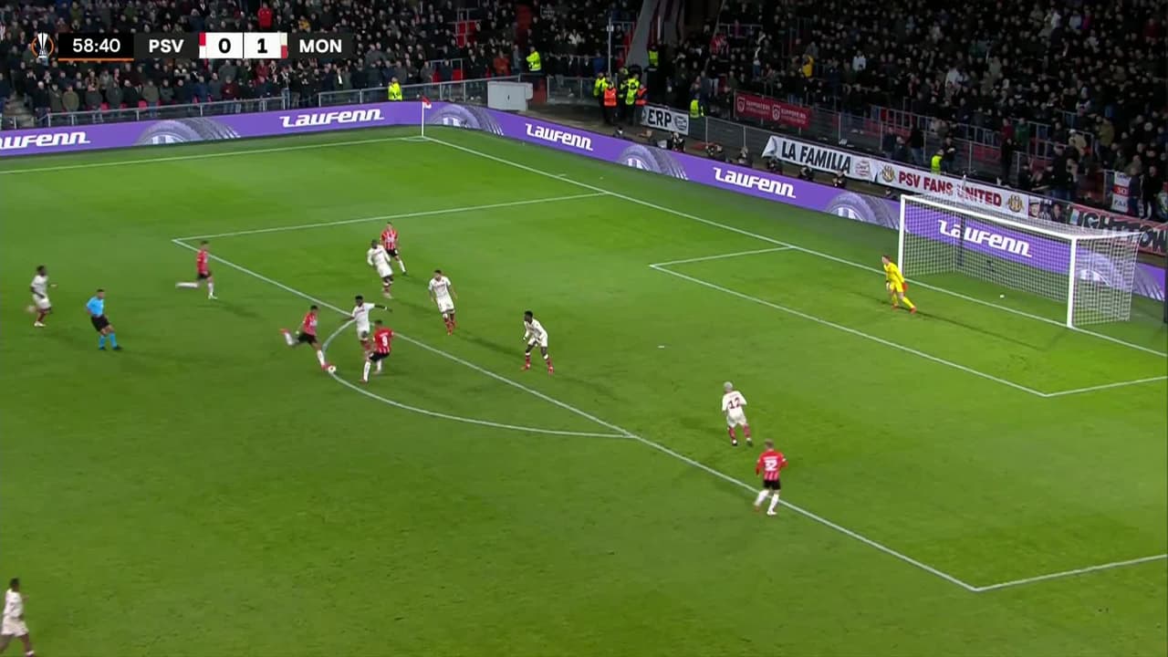 ¡Gol! PSV Eindhoven 1| AS Monaco 1. Cody Gakpo (PSV Eindhoven) Disparo con la derecha desde fuera del área.