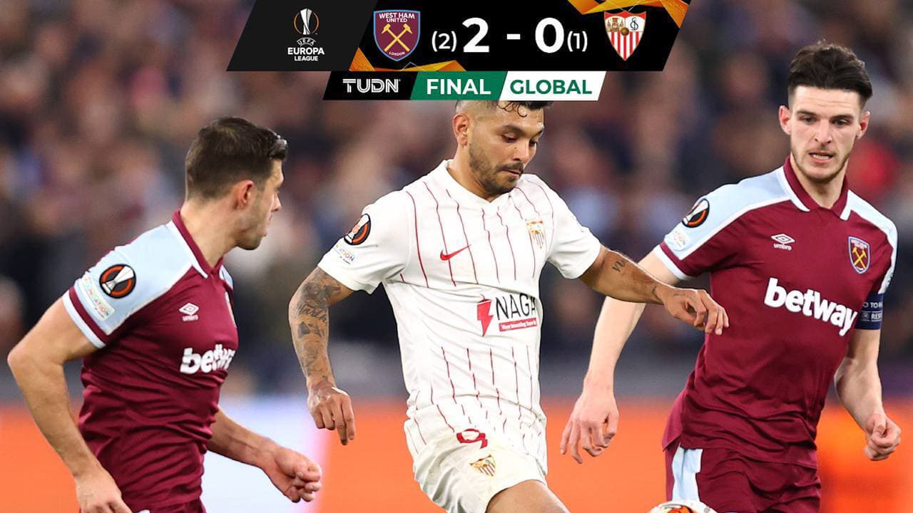 Jesús 'Tecatito' Corona y el Sevilla cayeron en Londres 2-0 ante el West Ham en tiempo extra con goles de Tomás Soucek y Andriy Yarmolenko para irse eliminados de la Europa League.