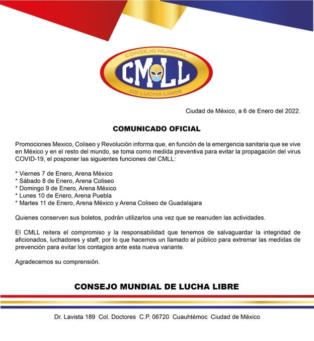 Además, el CMLL lanzó una invitación para que los aficionados extremen las medidas de prevención para evitar los contagios ante la nueva variante del coronavirus.