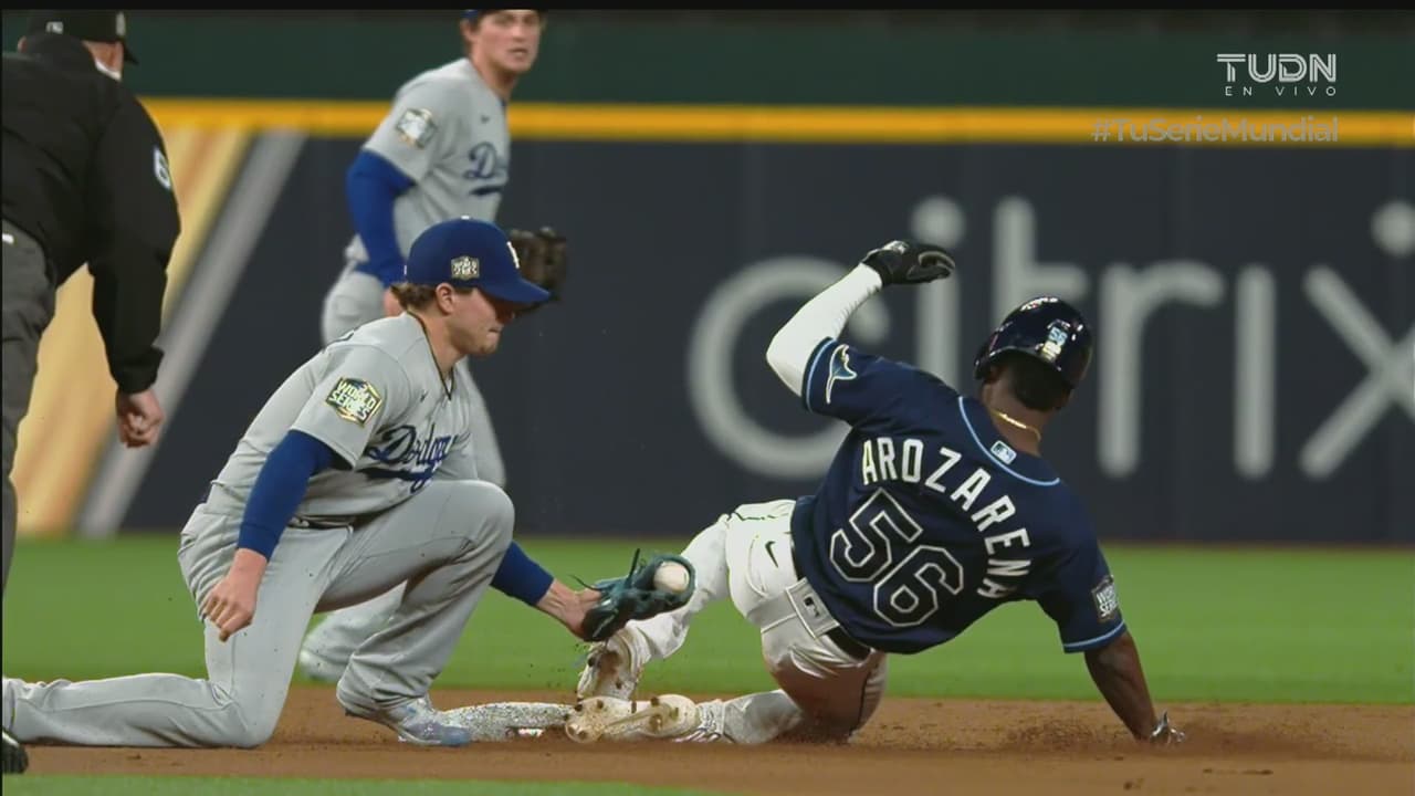 La sensación de los playoffs y Tampa Bay Rays, Randy Arozarena, se quiso robar la segunda base pero Kike Hernández estuvo atento para sacarlo con una gran jugada.