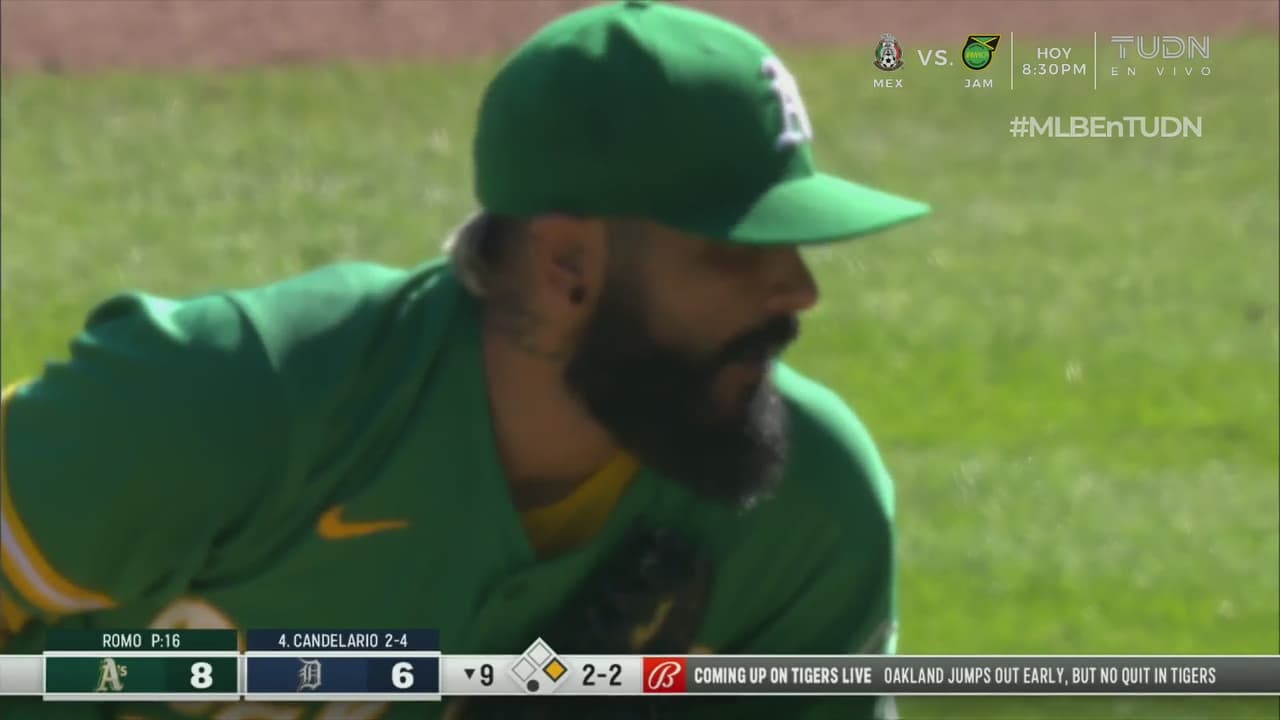 El lanzador mexicano Sergio Romo obtuvo su segundo salvamento de la temporada de MLB este jueves luego de colgar el cero y ceder una base por bola y ponchar a un rival en la victoria de Oakland Athletics 8-6 frente a Detroit Tigers.