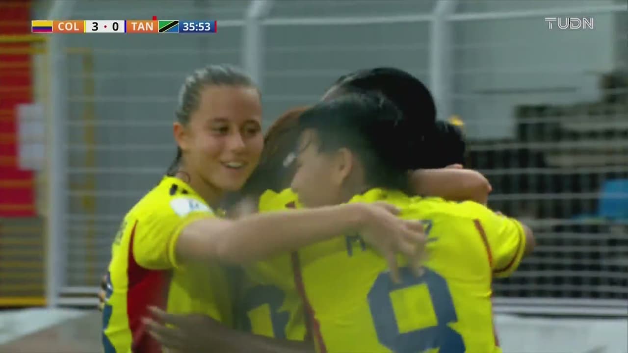 Colombia sorprendió de nuevo a la defensa de Tanzania con un centro desde la izquierda que Yésica Muñoz encuadró en el minuto 17, firmando el 2-0.