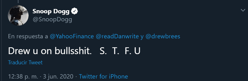 Snoop Dog no contuvo su ira en Twitter y respondió de la siguiente forma (palabras que hemos diluido en la traducción):