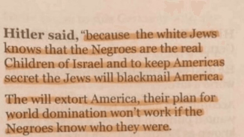 DeSean Jackson compartió un extracto en el que se lee: "Los judíos blancos chantajearán a los Estados Unidos porque saben que los negros son los verdaderos Hijos de Israel. Extorsionarán a Estados Unidos, pero su plan de dominación no funcionará si los negros se dan cuenta de quiénes son".
