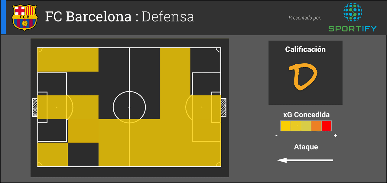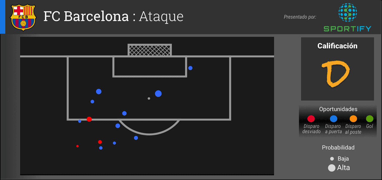 Al Barcelona se le hizo dificil terminar sus intentos, los cuales principalmente lanzó por el lado izquierdo. Los azulgrana tuvieron cinco disparos con dirección de puerta desde el interior del área grande y tomaron ocho disparos desde fuera del área, entre ellos el tiro libre que desvió Messi desde el borde del área grande en los momentos finales del partido.